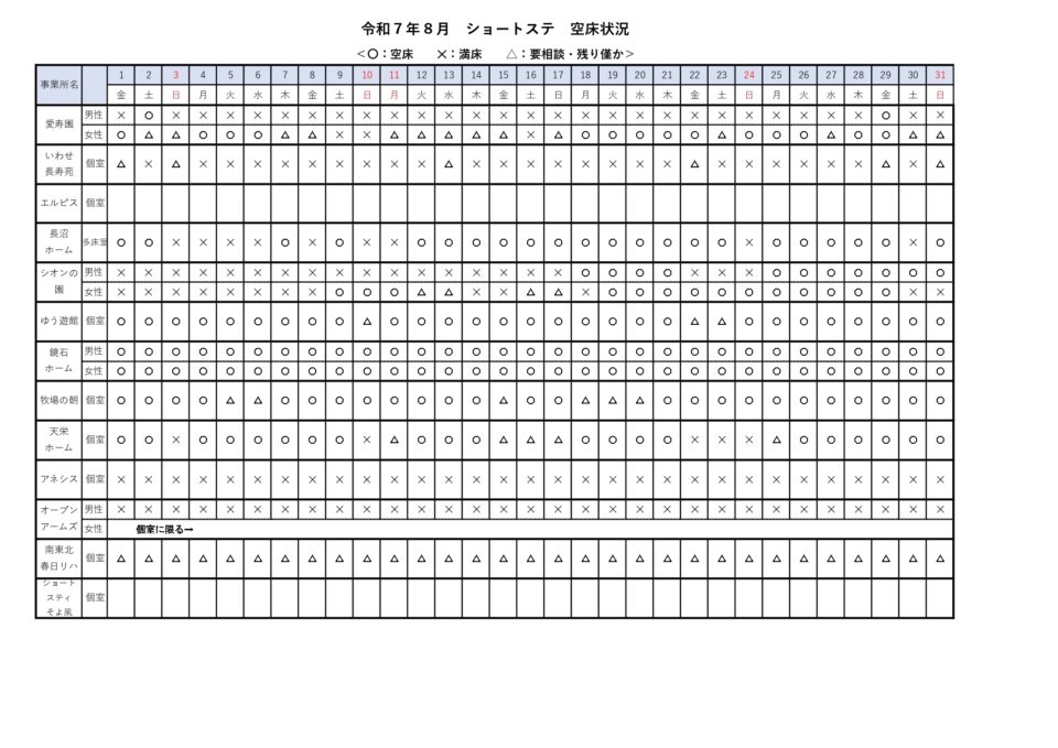 お知らせ ホーム > お知らせ > 短期入所空床状況(8/1~8/31) 短期入所空床状況(8/1~8/31) 2025/07/25 空欄事業所については、随時更新していきます PDFはこちらからダウンロード お知らせ一覧 カテゴリー お知らせショートステイ空き情報 月別投稿一覧 月を選択 2026年1月 (1) 2025年12月 (2) 2025年10月 (2) 2025年9月 (1) 2025年7月 (3) 2025年6月 (1) 2025年5月 (2) 2025年4月 (1) 2025年3月 (1) 2025年2月 (1) 2025年1月 (3) 2024年12月 (1) 2024年11月 (2) 2024年9月 (2) 2024年8月 (1) 2024年7月 (1) 2024年6月 (1) 2024年5月 (2) 2024年3月 (2) 2024年2月 (1) 2024年1月 (1) 2023年12月 (1) 2023年11月 (1) 2023年10月 (2) 2023年9月 (1) 2023年8月 (3) 2023年6月 (2) 2023年5月 (3) 2023年3月 (1) 2023年1月 (2) 2022年12月 (2) 2022年11月 (3) 2022年10月 (4) 2022年9月 (3) 2022年8月 (1) 2022年7月 (3) 2022年6月 (3) 2022年5月 (2)