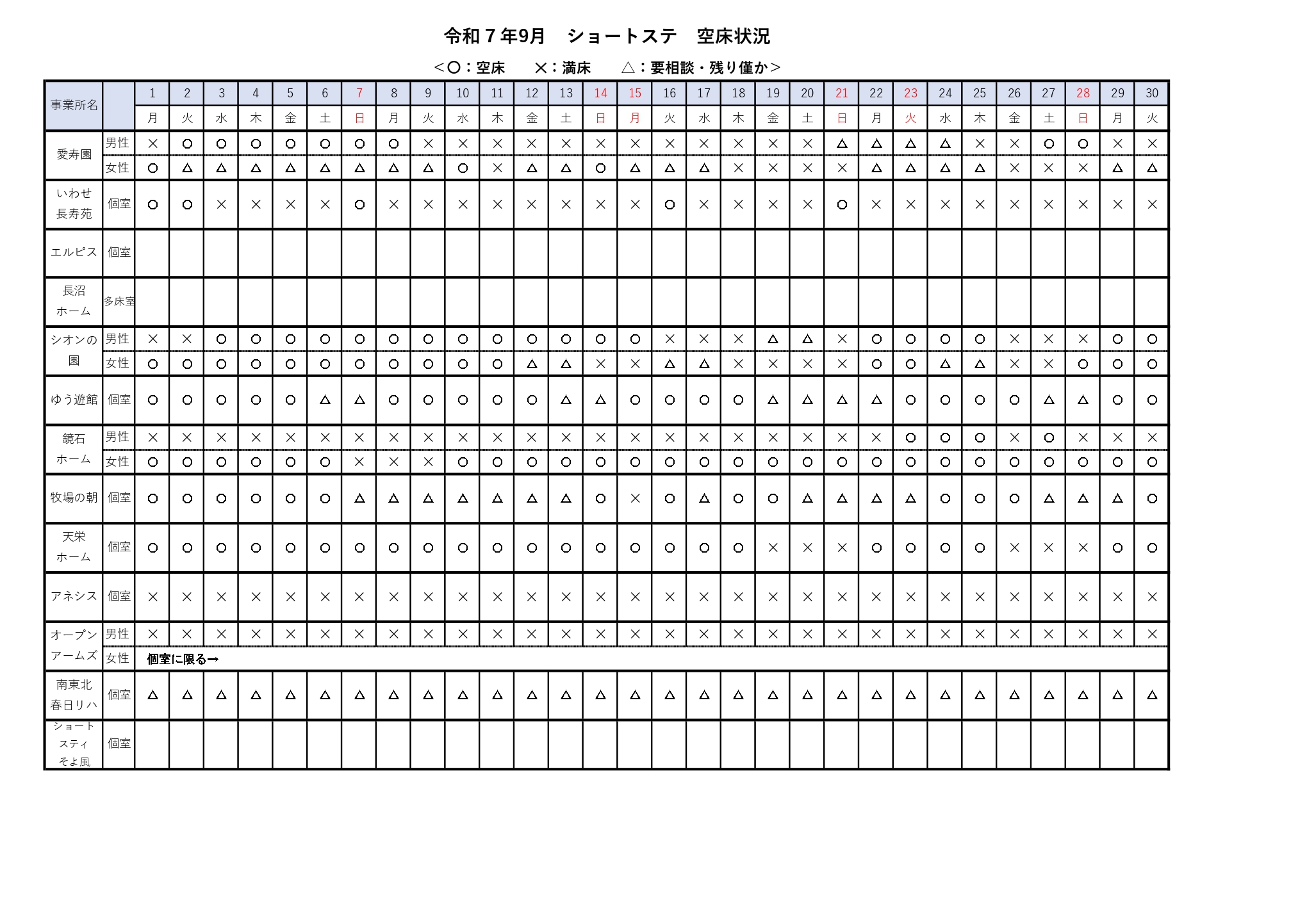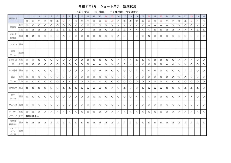 短期入所空床状況(9/1~9/30)