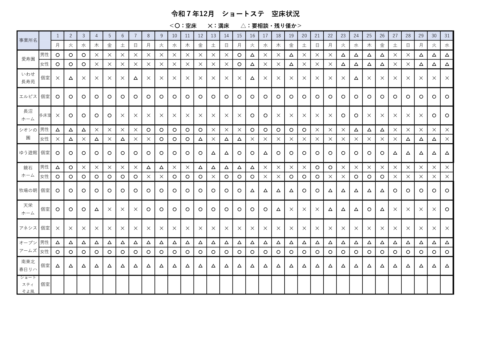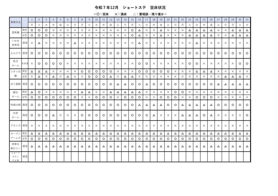 お知らせ ホーム > お知らせ > 短期入所空床状況(12/1~12/31) 短期入所空床状況(12/1~12/31) 2025/12/04 PDFはこちらからダウンロード お知らせ一覧 カテゴリー お知らせショートステイ空き情報 月別投稿一覧 月を選択 2026年1月 (1) 2025年12月 (2) 2025年10月 (2) 2025年9月 (1) 2025年7月 (3) 2025年6月 (1) 2025年5月 (2) 2025年4月 (1) 2025年3月 (1) 2025年2月 (1) 2025年1月 (3) 2024年12月 (1) 2024年11月 (2) 2024年9月 (2) 2024年8月 (1) 2024年7月 (1) 2024年6月 (1) 2024年5月 (2) 2024年3月 (2) 2024年2月 (1) 2024年1月 (1) 2023年12月 (1) 2023年11月 (1) 2023年10月 (2) 2023年9月 (1) 2023年8月 (3) 2023年6月 (2) 2023年5月 (3) 2023年3月 (1) 2023年1月 (2) 2022年12月 (2) 2022年11月 (3) 2022年10月 (4) 2022年9月 (3) 2022年8月 (1) 2022年7月 (3) 2022年6月 (3) 2022年5月 (2)