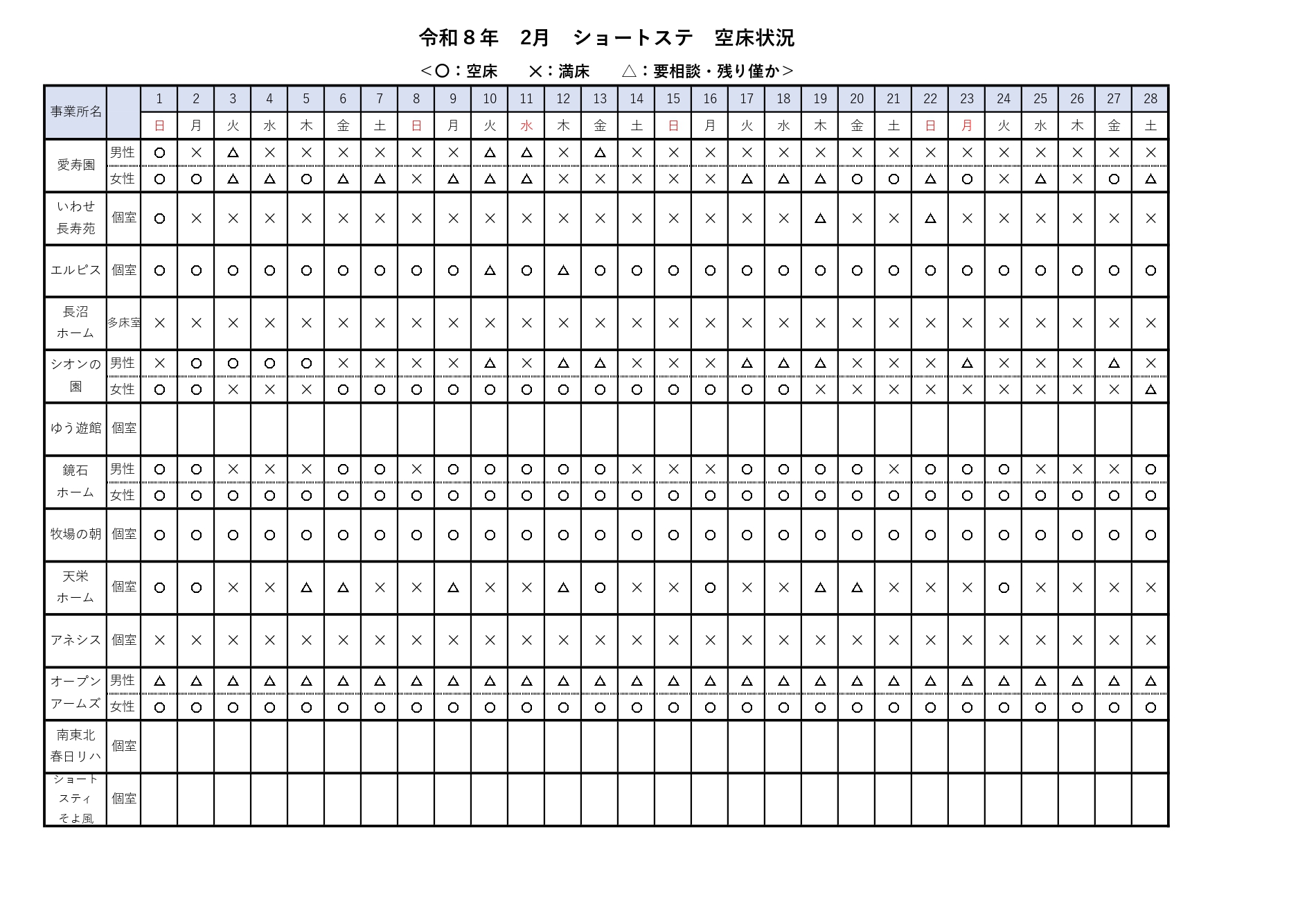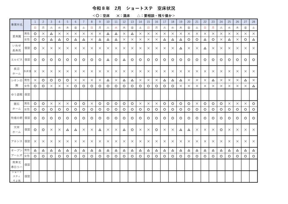 お知らせ ホーム > お知らせ > 短期入所空床状況(2/1~2/28) 短期入所空床状況(2/1~2/28) 2026/01/26 空欄事業所に関しては随時更新していきます PDFはこちらからダウンロード お知らせ一覧 カテゴリー お知らせショートステイ空き情報 月別投稿一覧 月を選択 2026年1月 (1) 2025年12月 (2) 2025年10月 (2) 2025年9月 (1) 2025年7月 (3) 2025年6月 (1) 2025年5月 (2) 2025年4月 (1) 2025年3月 (1) 2025年2月 (1) 2025年1月 (3) 2024年12月 (1) 2024年11月 (2) 2024年9月 (2) 2024年8月 (1) 2024年7月 (1) 2024年6月 (1) 2024年5月 (2) 2024年3月 (2) 2024年2月 (1) 2024年1月 (1) 2023年12月 (1) 2023年11月 (1) 2023年10月 (2) 2023年9月 (1) 2023年8月 (3) 2023年6月 (2) 2023年5月 (3) 2023年3月 (1) 2023年1月 (2) 2022年12月 (2) 2022年11月 (3) 2022年10月 (4) 2022年9月 (3) 2022年8月 (1) 2022年7月 (3) 2022年6月 (3) 2022年5月 (2)